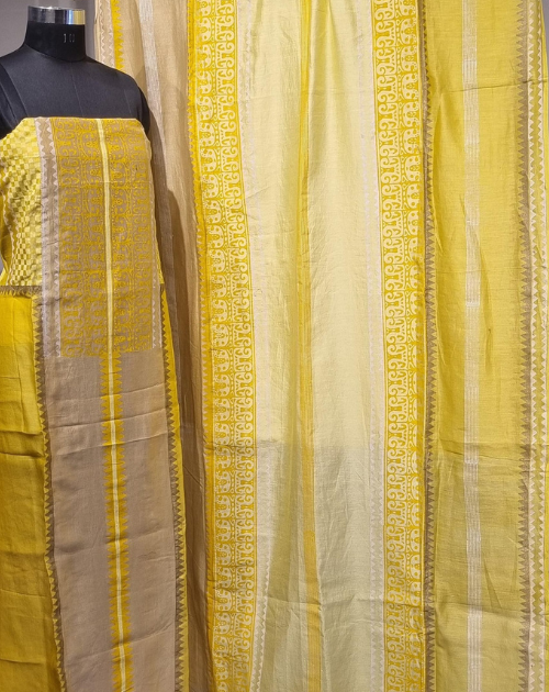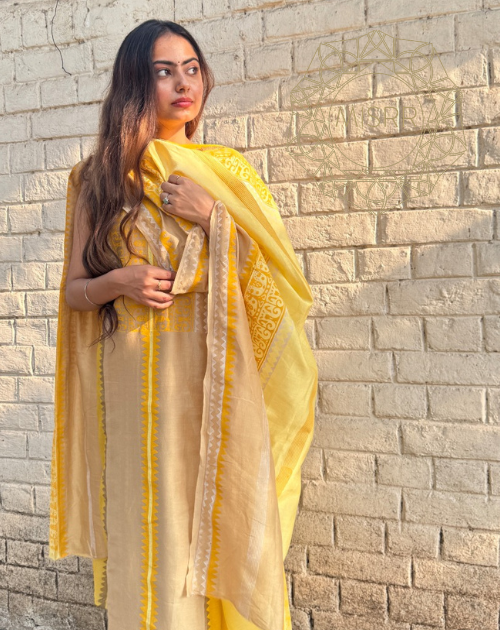 This ensemble features a lovely yellow and beige pureĀ  chanderi kurta that exudes elegance and depth, paired beautifully with a lightweight cotton palazzo for effortless comfort and flow. The look is completed with a graceful chanderi silk dupatta, adding a touch of traditional sophistication and refined charm, making it perfect for festive and special occasions.