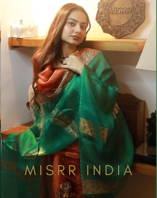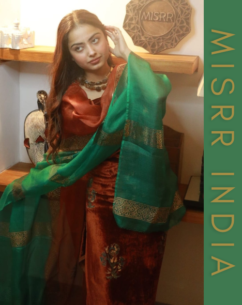 This ensemble features a rich copper velvet kurta that exudes elegance and depth, paired beautifully with a lightweight Kota silk palazzo for effortless comfort and flow. The look is completed with a graceful Uppada silk dupatta, adding a touch of traditional sophistication and refined charm, making it perfect for festive and special occasions.